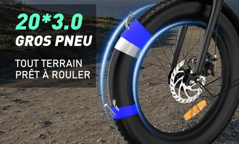 - Spécifications des pneus:Pneus pneumatiques;Pneu:20×3.0; Valve d’air:20×3.0 La valve de la chambre a air est AV.