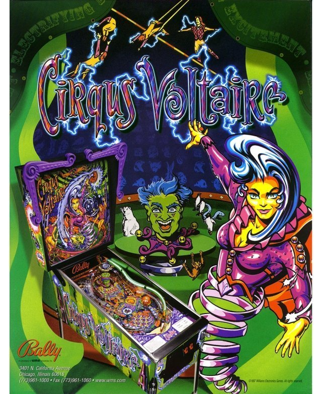 Bienvenue dans l’univers du cirque grâce à cet éclectique flipper Cirqus Voltaire du très réputé fabricant Bally. Ce flipper est haut en couleur et possède des originalités propres à ce modèle comme l’afficheur juste au dessus du plateau de jeu ou encore, l’animation « l’homme-canon » situé dans le fronton !