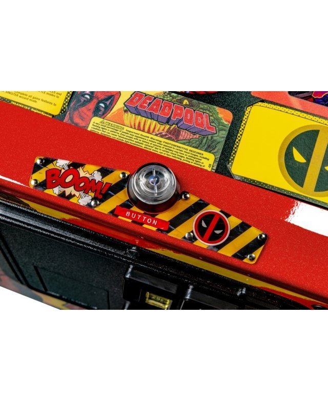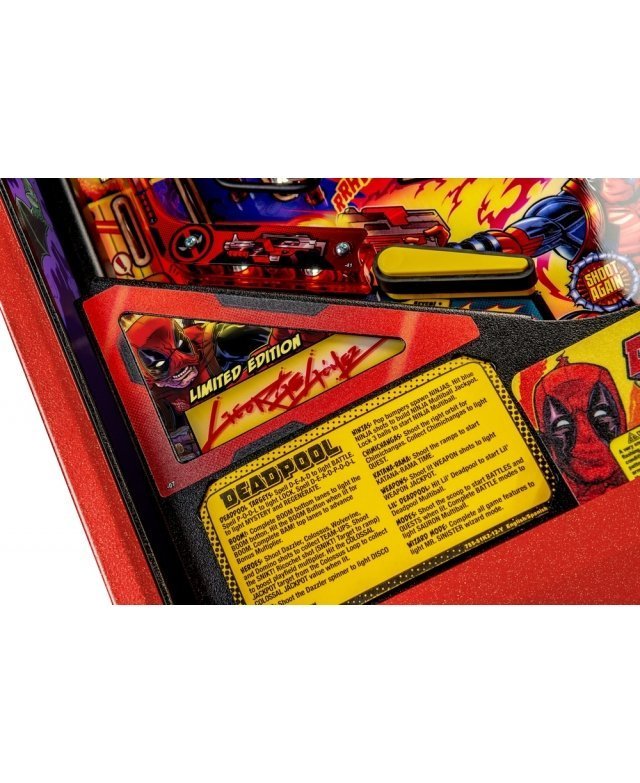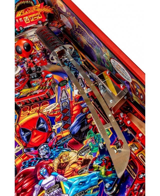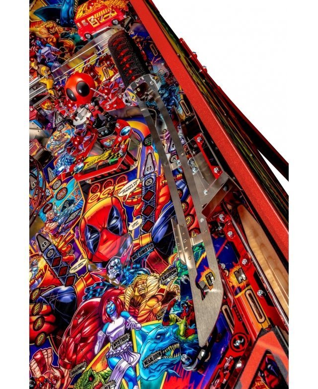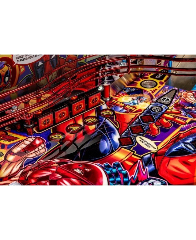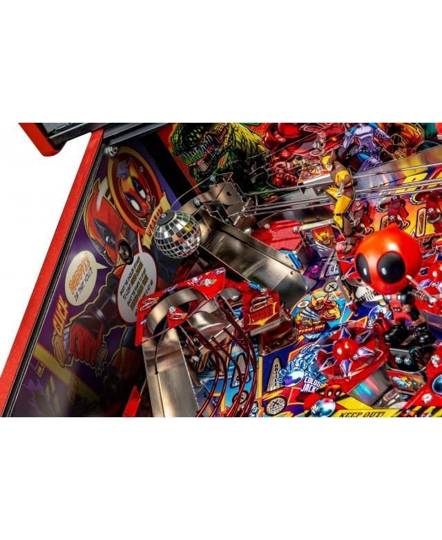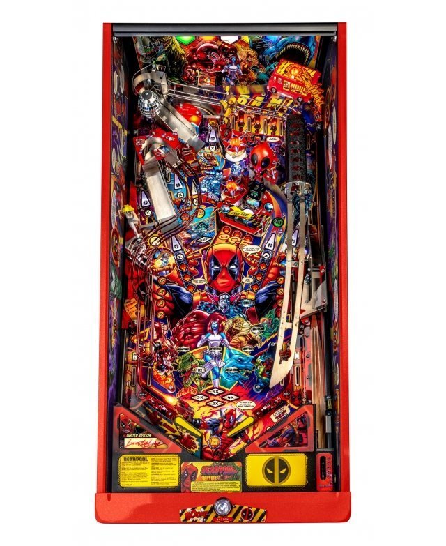 Les modèles Deadpool Pro, Premium et Limited Edition de Stern présentent des dessins à la main remarquables et distinctifs réalisés par le célèbre illustrateur Zombie Yeti. L’acteur bien connu Nolan North incarne la voix excentrique de Deadpool. Chaque flipper comprend une série de 3 cibles tombantes formant un verrou à billes qui protège une cible fixe située en bas de la magnifique figurine Lil’ Deadpool, lui même étant monté sur ressort pour apporter encore plus de dynamisme au jeu. De plus, tous les modèles comprennent deux rampes en acier inoxydable dont une avec un final de rampe sous la forme d’un splendide Katana! Le flipper Deadpool divertit avec un étonnant éventail de ninjas, vampires et chimichangas, ce qui le rend adapté à tous les niveaux de maîtrise.