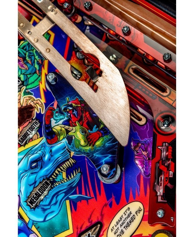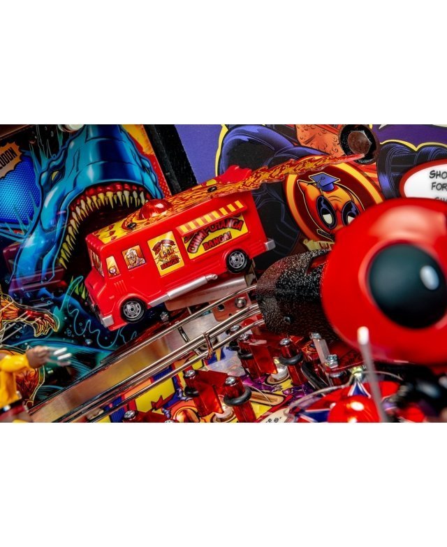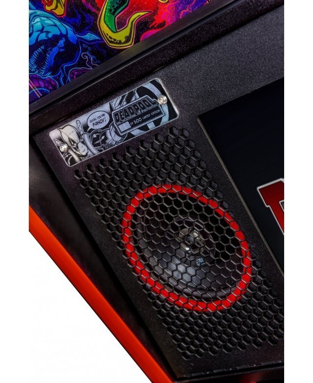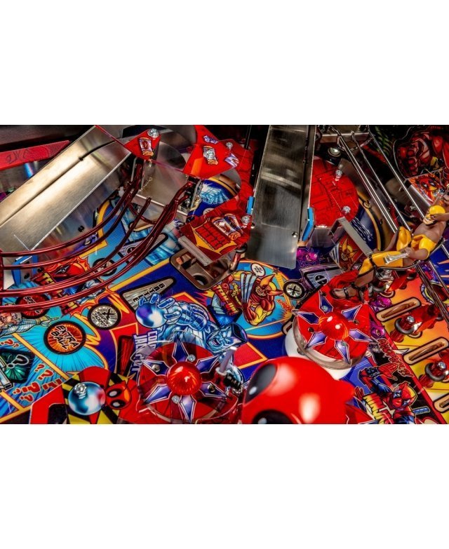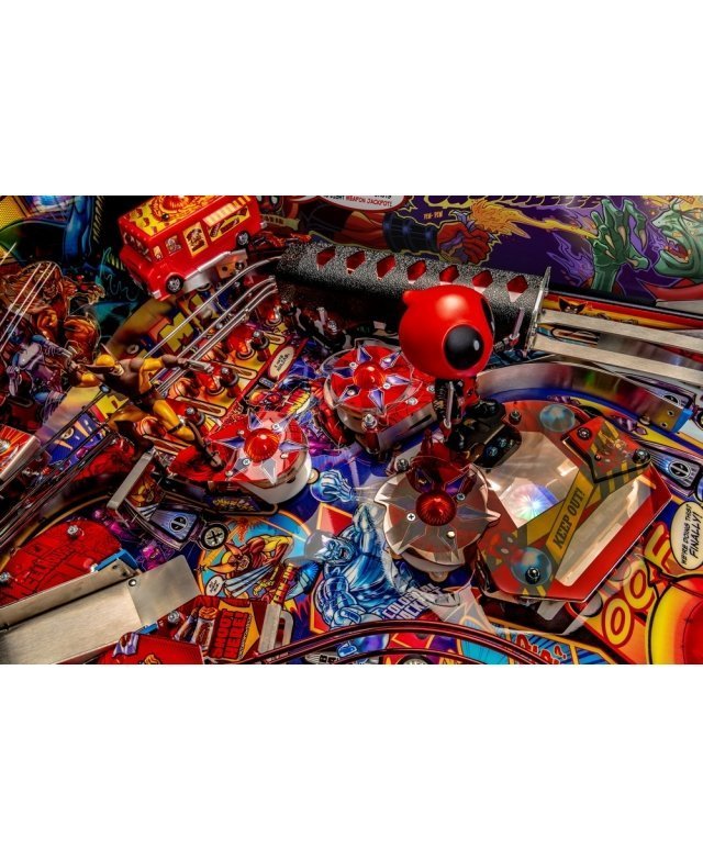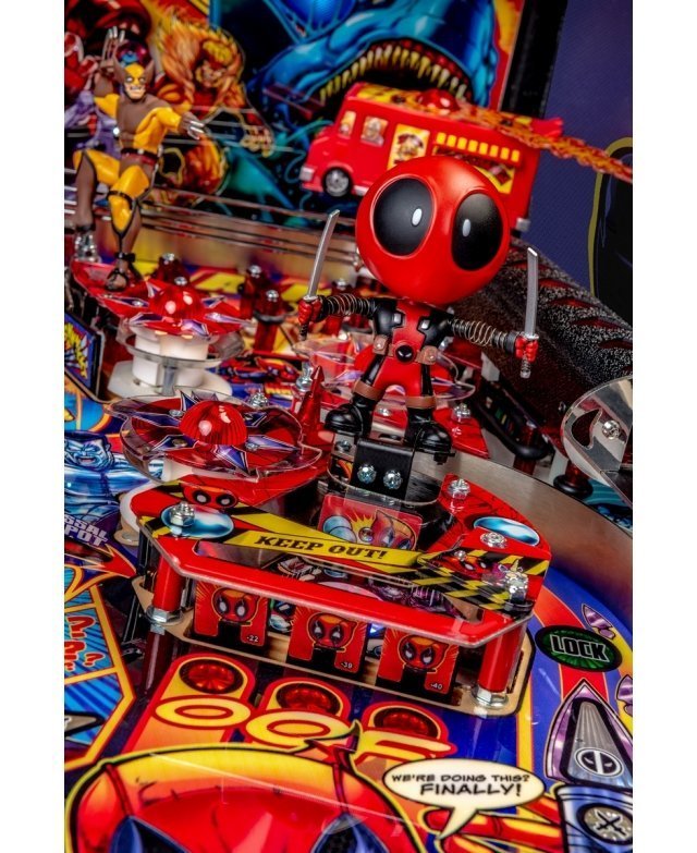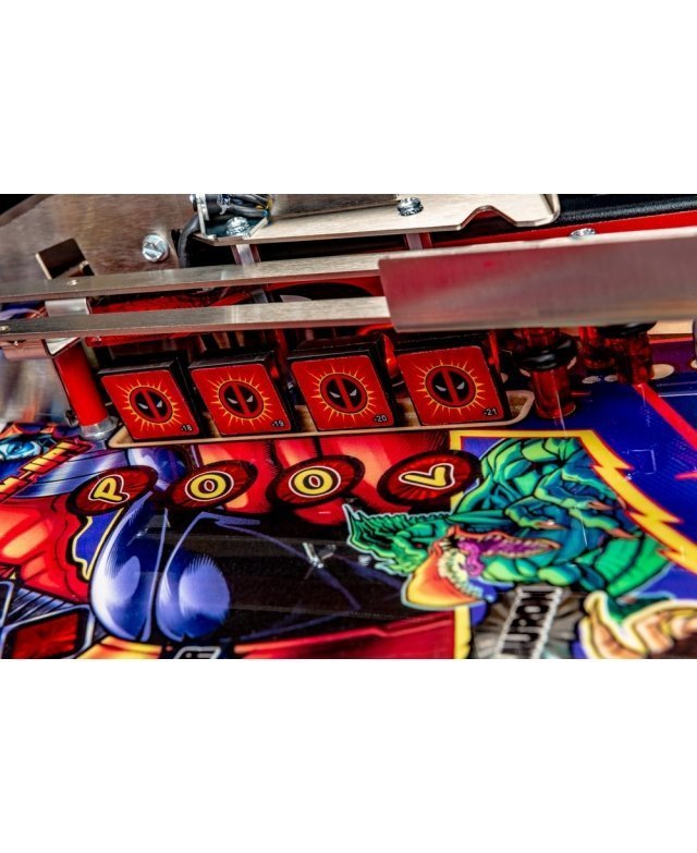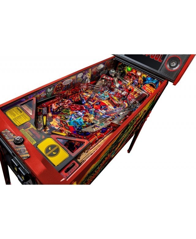 Les modèles Deadpool Pro, Premium et Limited Edition de Stern présentent des dessins à la main remarquables et distinctifs réalisés par le célèbre illustrateur Zombie Yeti. L’acteur bien connu Nolan North incarne la voix excentrique de Deadpool. Chaque flipper comprend une série de 3 cibles tombantes formant un verrou à billes qui protège une cible fixe située en bas de la magnifique figurine Lil’ Deadpool, lui même étant monté sur ressort pour apporter encore plus de dynamisme au jeu. De plus, tous les modèles comprennent deux rampes en acier inoxydable dont une avec un final de rampe sous la forme d’un splendide Katana! Le flipper Deadpool divertit avec un étonnant éventail de ninjas, vampires et chimichangas, ce qui le rend adapté à tous les niveaux de maîtrise.
