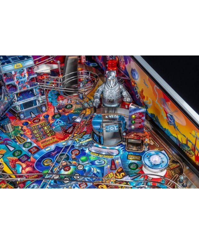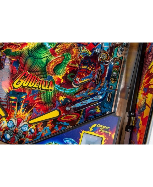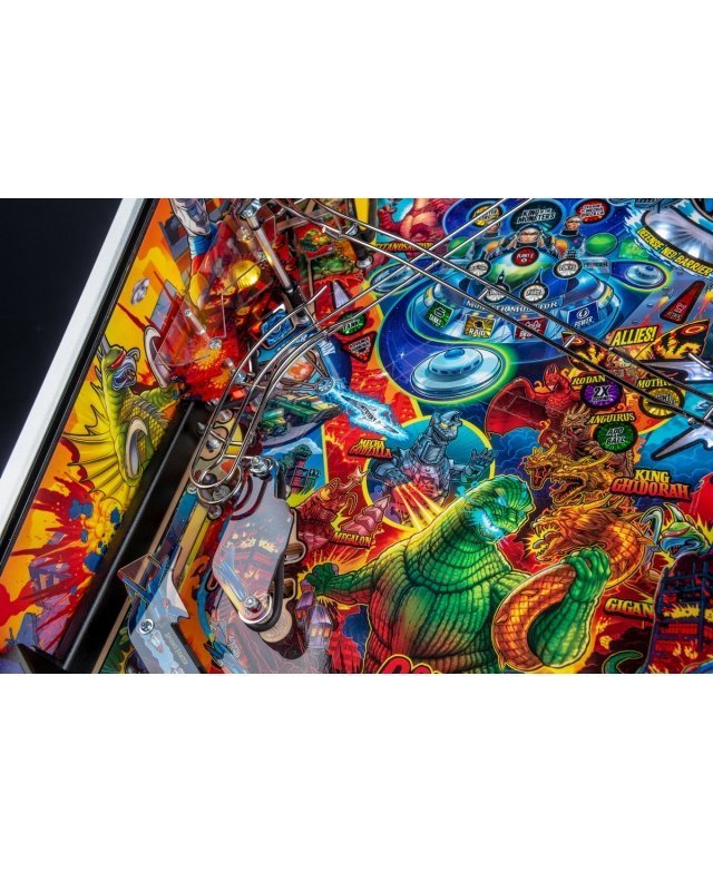 Le chaos et la destruction sont au rendez-vous sur le plateau de jeu avec le Godzilla multiball, que l’on démarre en tirant l’un des différents coups dans et à travers le gratte-ciel situé au centre. Dans les modèles Premium et LE, un moteur actionne le gratte-ciel, déviant les balles à travers chacun de ses cinq étages pendant qu’il s’effondre, pour finalement bloquer trois balles sur son toit. Le terrain de jeu Premium/LE comporte également une passerelle qui s’effondre. Cette rampe animée est gardée par un Godzilla moulé sur mesure et peut détourner les boules vers le flipper ou directement sur le terrain de jeu pendant le multi-ball Bridge Attack.