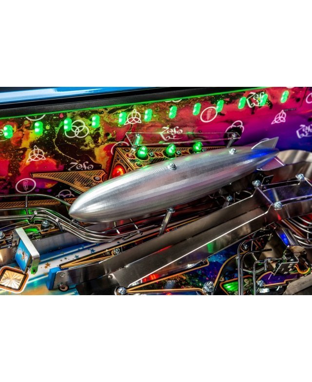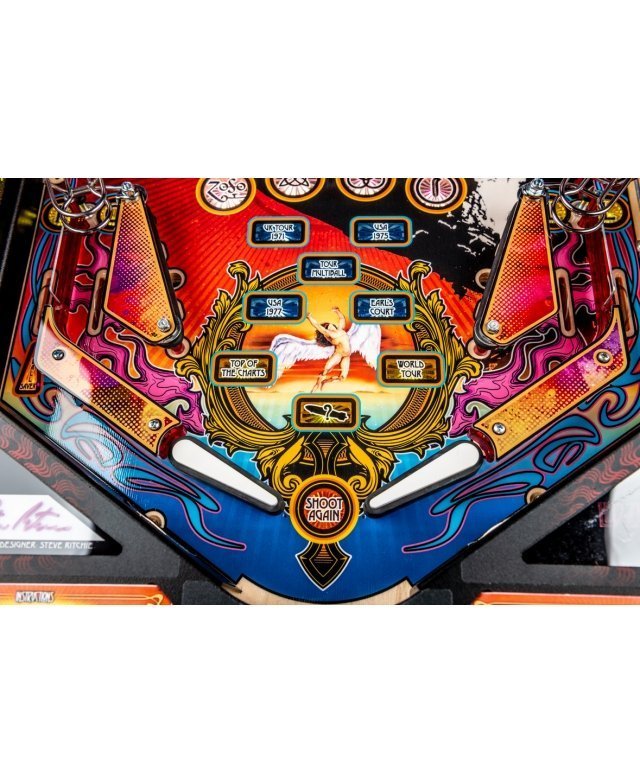 Chaque version du flipper Led Zeppelin (Pro, Premium et Limited Edition) est dotée d’une immense figurine Hindenburg Zeppelin moulé sur mesure, basé sur l’imagerie iconique de l’album « Led Zeppelin I ». Lorsqu’il est allumé, le jouet Zeppelin permet de collecter des points au travers du scénario de jeu pour aboutir à un multi-ball spécial Zeppelin. Une figurine superbement sculptée représente Icare (Icarus est une marque déposée de Swan Song Records, le label indépendant créé par Led Zep’) prenant son envol lorsque sa base est percutée par une bille à toute vitesse. Ce mécanisme représente symboliquement la montée d’Icare vers le soleil, prêt à tout pour s’élever dans le ciel, quitte à se bruler les ailes, telle une vie de rockstar. Une série de trois cibles tombantes, trois rampes en acier et trois raquettes donnent au flipper une très belle fluidité.