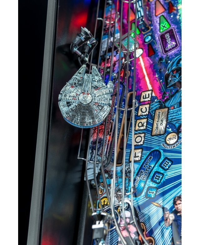 La spécificité du plateau Premium se distingue notamment avec la présence d’une rampe accélérateur hyper-espace qui fait le tour complet du plateau et pouvant accueillir jusqu’à 5 billes, un superbe Faucon Millenium sculpté et éclairé à LED mais également, d’une Etoile de la Mort qui s’ouvre en fonction de l’avancée du joueur dans le scénario… Attention, ouvrir l’Etoile de la Mort se révèle être un vrai défi !
