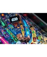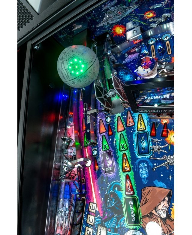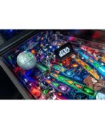 Le modèle Premium comporte également des illustrations représentant une étoile de la mort animée, un faucon Millenium sculpté et éclairé par des LED et une boucle hyper-espace interactive qui fait le tour du plateau de jeu et peut accueillir jusqu’à 5 billes de flipper à la fois.