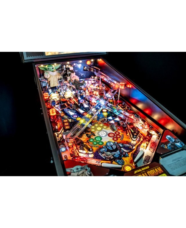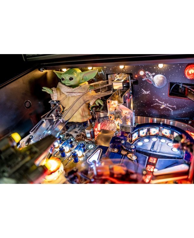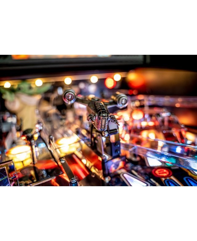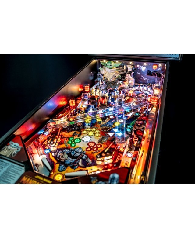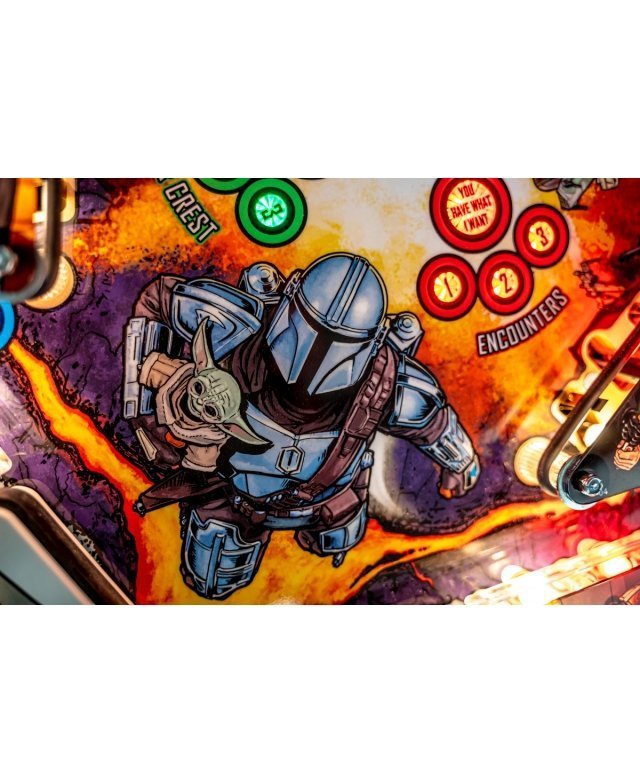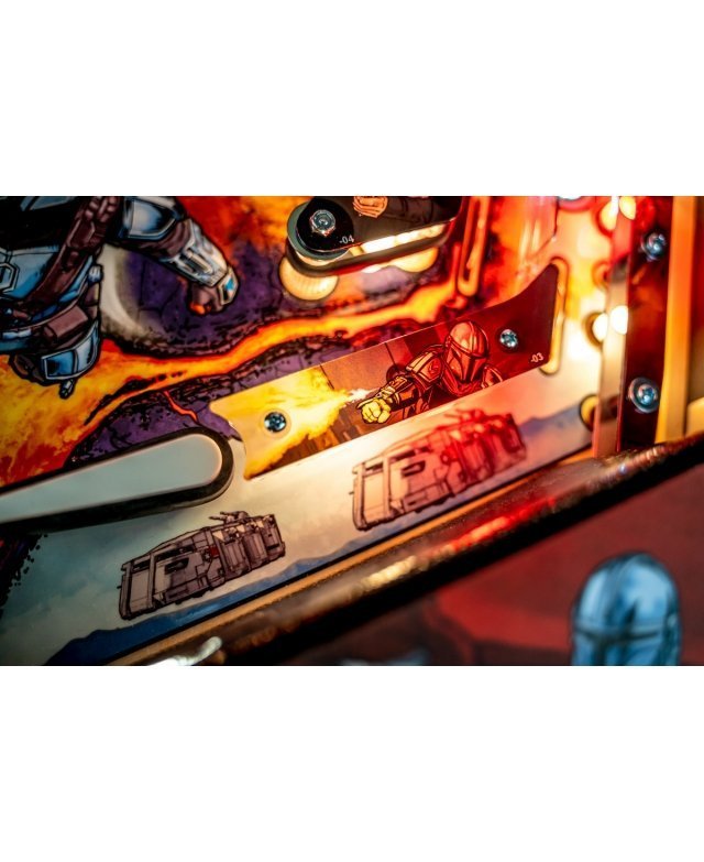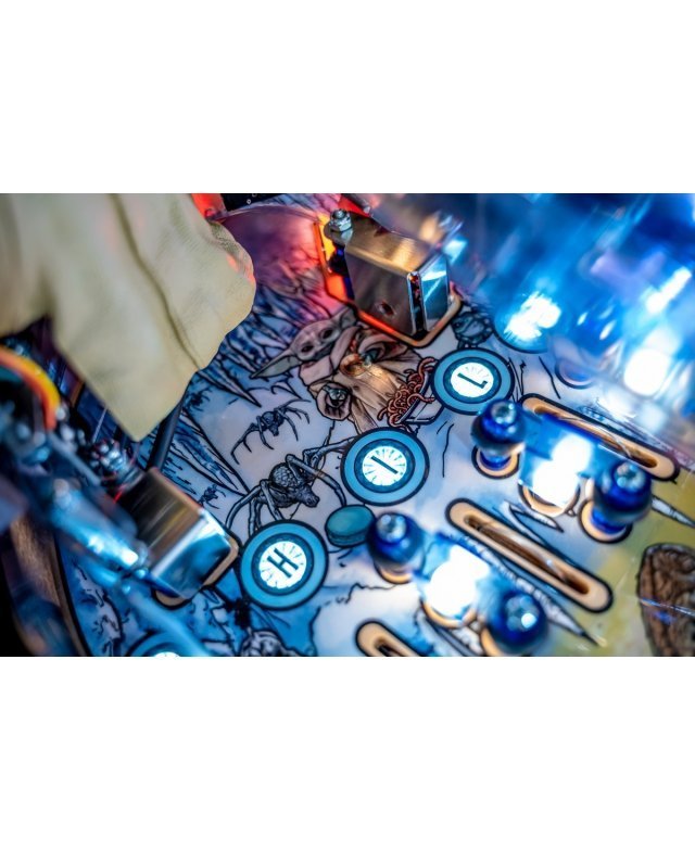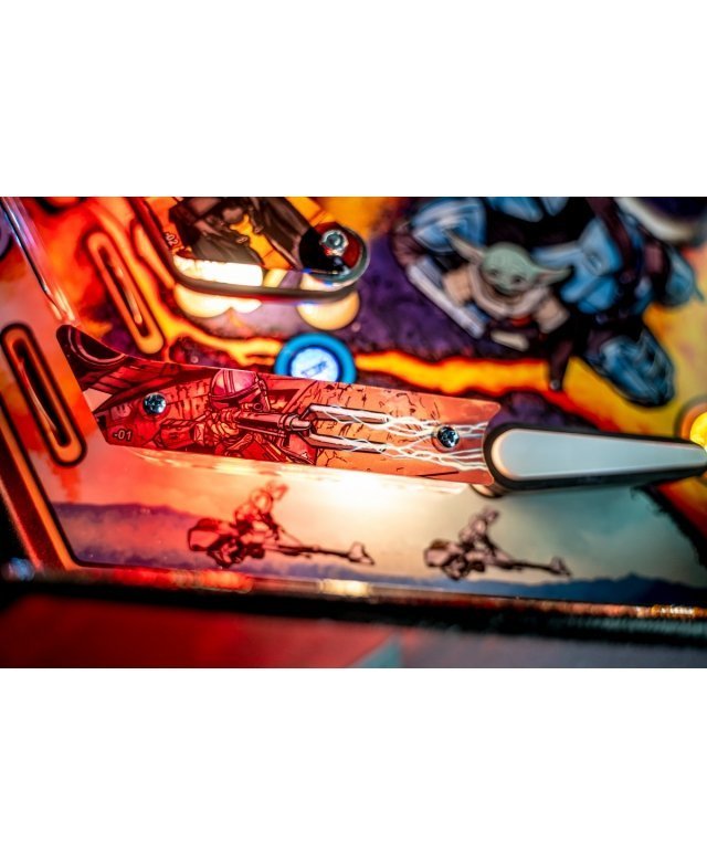 Dès la version Pro, le jeu est très amusant avec ce plateau très dense et particulièrement varié : deux superbes rampes, 1 mini-plateau avec 1 raquette dédiée et 6 cibles fixes, un sculptural baby-yooda, et quelques petits modules inédits ! Une cible unique suspendue à un vaisseau Razor Crest, moulé sur mesure, permet d’accéder à un multi-balls spécifique. Le fait de réussir à toucher la cible donne droit à un tir sur la rampe centrale et ceux sur les trois versions du flippers. Egalement, chaque version du flipper The Mandalorian est animée par la voix de l’acteur Carl Weathers (Greef Karga). Le jeu comprend la bande-originale emblématique de Ludwig Göransson et une superbe illustration dessinée à la main par Randy Martinez, l’un des artistes de bande dessinée les plus populaires du moment.