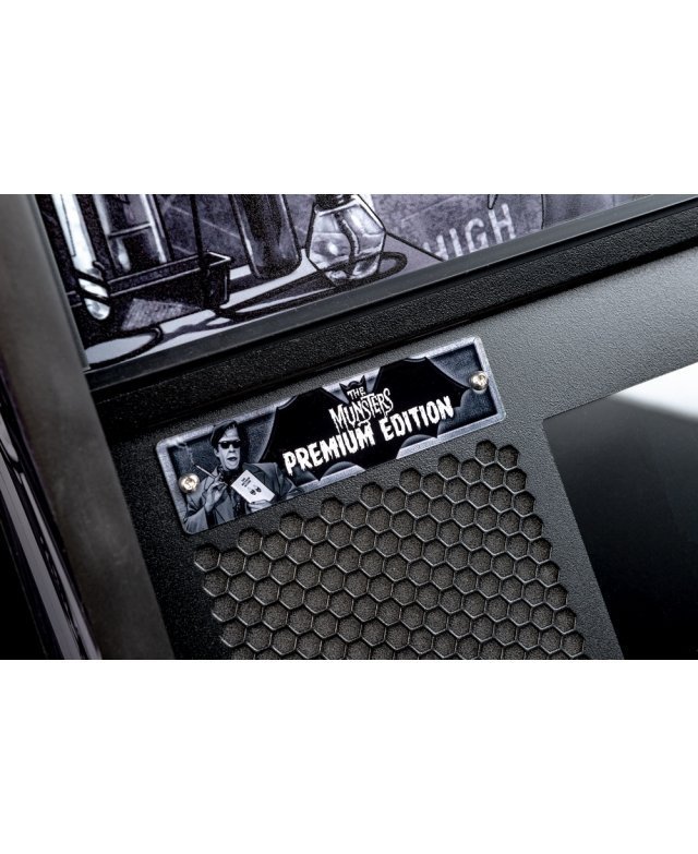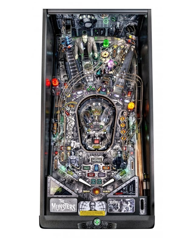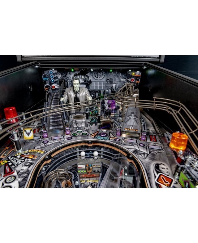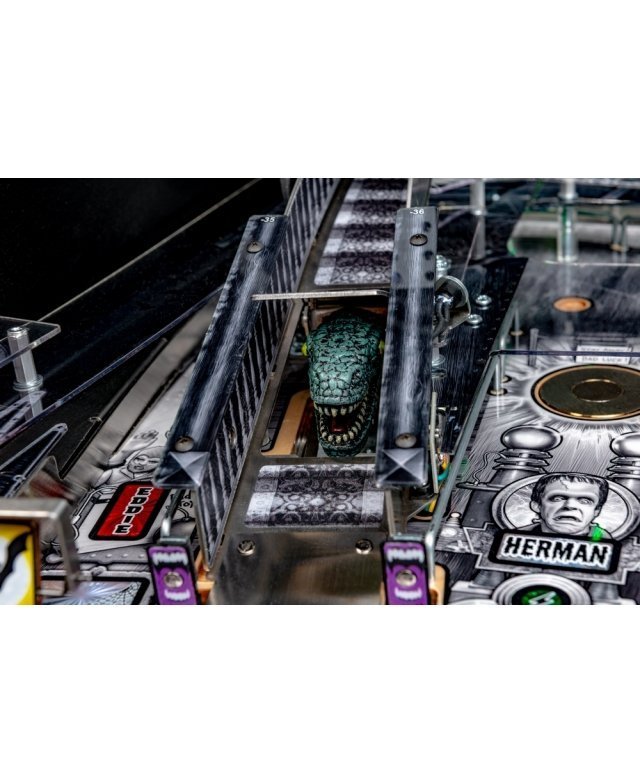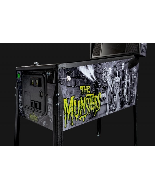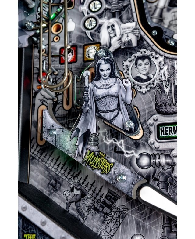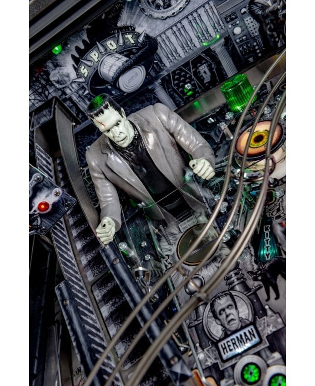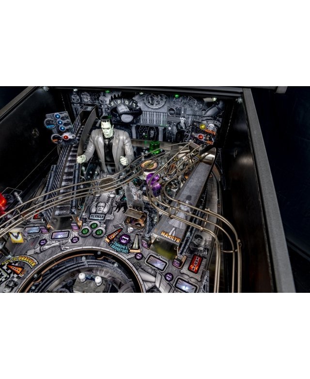 Les modèles The Munsters Pro, Premium et Limited Edition de Stern présentent des dessins à la main remarquables et distinctifs entre chaque version. Chaque jeu présente une superbe figurine Herman sculpté sur mesure avec un puissant aimant à ses pieds, mettant en scène le multi-billes Herman. Il est présent deux grandes rampes métalliques en finition bronze avec notamment la figurine Spot (le chien-dragon de la famille !) cachée sous la rampe de gauche. A l’inverse, la rampe de droite débute par un impressionnant demi-tour vertical. Sur le côté gauche, est situé une voiture de course Drag-u-la sculptée sur mesure près d’un éjecteur de bille qui l’envoie à la vitesse d’un dragster. L’écran HD en guise d’afficheur apporte un vrai plus en terme d’animations avec plein de vidéos originales de la série qui accompagne le joueur dans les missions.
