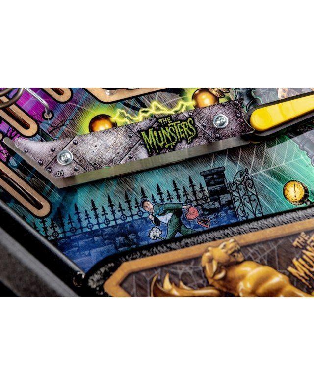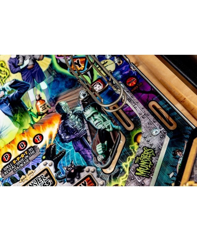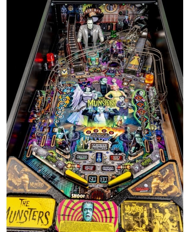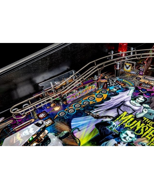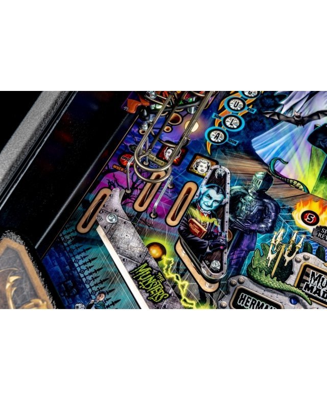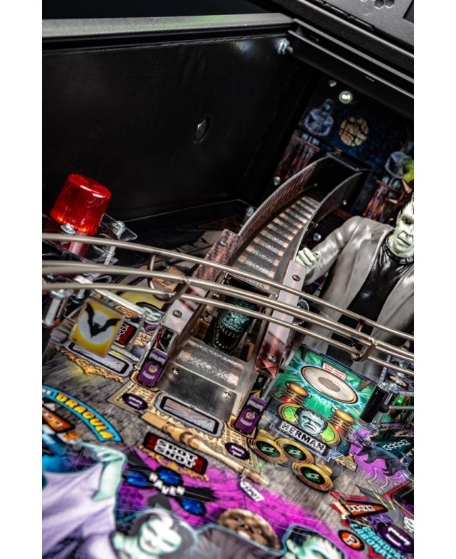 Les modèles The Munsters Pro, Premium et Limited Edition de Stern présentent des dessins à la main remarquables et distinctifs entre chaque version. Chaque jeu présente une superbe figurine Herman sculpté sur mesure avec un puissant aimant à ses pieds, mettant en scène le multi-billes Herman. Il est présent deux grandes rampes métalliques en finition bronze avec notamment la figurine Spot (le chien-dragon de la famille !) cachée sous la rampe de gauche. A l’inverse, la rampe de droite débute par un impressionnant demi-tour vertical. Sur le côté gauche, est situé une voiture de course Drag-u-la sculptée sur mesure près d’un éjecteur de bille qui l’envoie à la vitesse d’un dragster. L’écran HD en guise d’afficheur apporte un vrai plus en terme d’animations avec plein de vidéos originales de la série qui accompagne le joueur dans les missions.