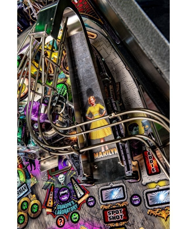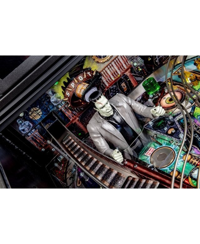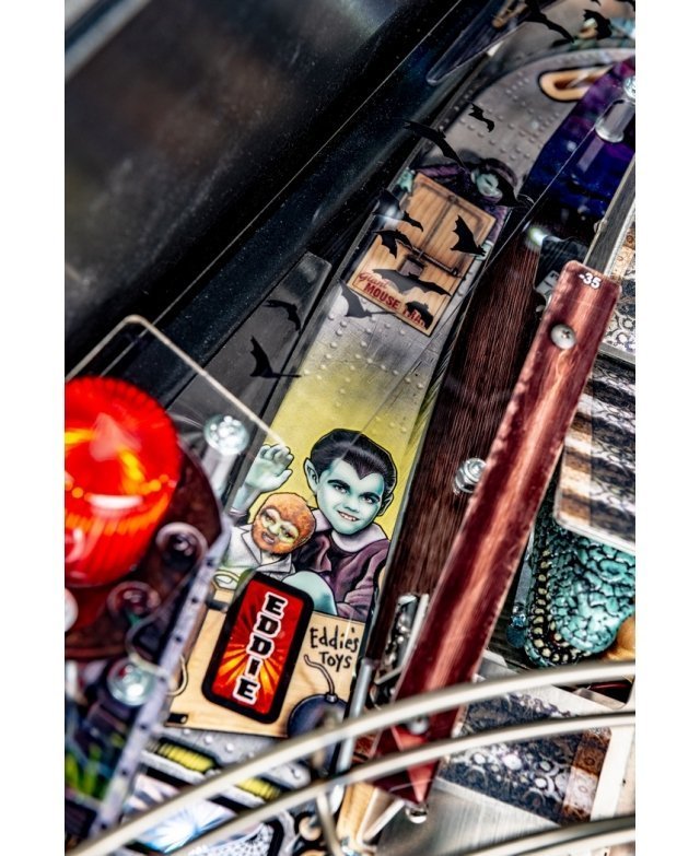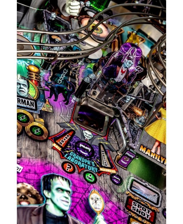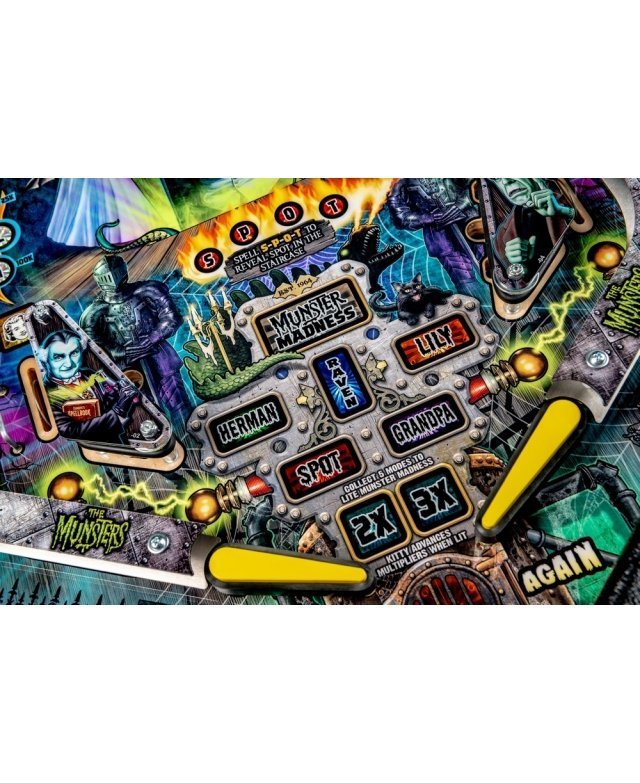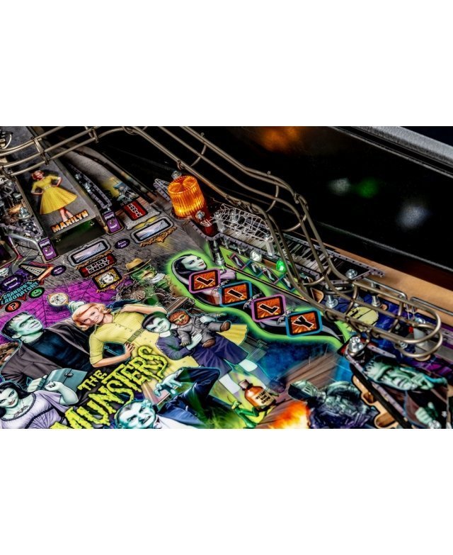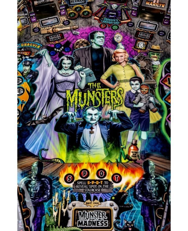 Les modèles The Munsters Pro, Premium et Limited Edition de Stern présentent des dessins à la main remarquables et distinctifs entre chaque version. Chaque jeu présente une superbe figurine Herman sculpté sur mesure avec un puissant aimant à ses pieds, mettant en scène le multi-billes Herman. Il est présent deux grandes rampes métalliques en finition bronze avec notamment la figurine Spot (le chien-dragon de la famille !) cachée sous la rampe de gauche. A l’inverse, la rampe de droite débute par un impressionnant demi-tour vertical. Sur le côté gauche, est situé une voiture de course Drag-u-la sculptée sur mesure près d’un éjecteur de bille qui l’envoie à la vitesse d’un dragster. L’écran HD en guise d’afficheur apporte un vrai plus en terme d’animations avec plein de vidéos originales de la série qui accompagne le joueur dans les missions.