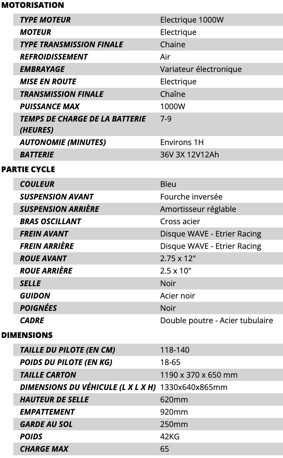 SmallMX Dirt Bike Enfant Électrique smx RKT 1000W – Bleu